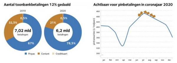 Aan het slot van afgelopen jaar was ongeveer 20% van alle betalingen aan de toonbank met contant geld. Een jaar eerder was dat nog zo’n 30%. Door deze sterke daling van het aantal contante betalingen was het geschatte totale aantal van 6,2 miljard transacties aan de kassa zo’n 12% lager dan in 2019. De bijbehorende omzet was 2% lager, met naar schatting €148 miljard.