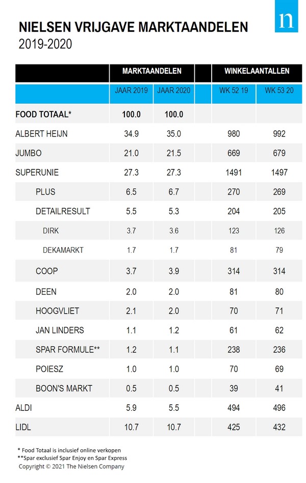 Nederlandse supermarken volgens IRI en Nielsen zijn bekend. In 2020, waarin de supermarktomzetten sterk gestegen zijn door de Corona maatregelen, laten, mede gerelateerd aan de angst voor het virus, full service supermarkten met een breed assortiment groei zien in marktaandeel, terwijl prijsvechters en Hard Discount marktaandeel inleveren.