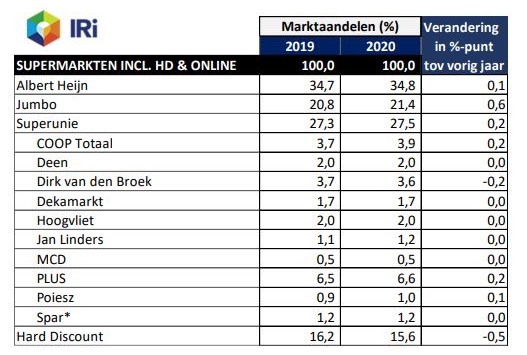 Nederlandse supermarken volgens IRI en Nielsen zijn bekend. In 2020, waarin de supermarktomzetten sterk gestegen zijn door de Corona maatregelen, laten, mede gerelateerd aan de angst voor het virus, full service supermarkten met een breed assortiment groei zien in marktaandeel, terwijl prijsvechters en Hard Discount marktaandeel inleveren.
