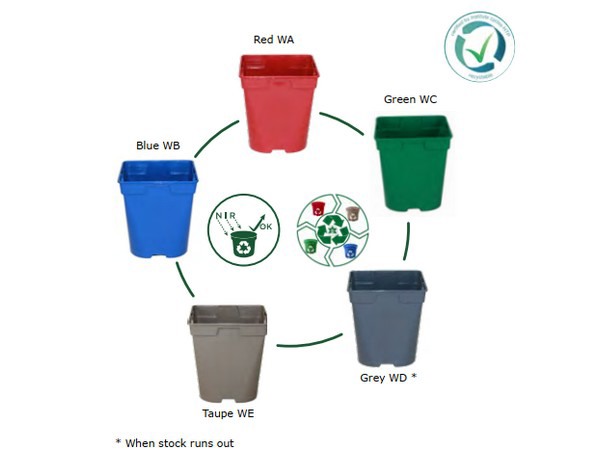 Ook wat spuitgietproducten betreft blijft Soparco zijn verschillende gamma's uitbreiden om steeds meer producten uit voorraad leverbaar te maken in zeven standaardkleuren. "Ze zijn allemaal NIR detecteerbaar en Cyclos gecertificeerd: rood WA, blauw WB, groen WC, taupe WE, grijs WD, dennengroen 54 en terracotta 17. Dit is ook het geval voor de nieuwe milieuvriendelijke pot Eole 23 cm."