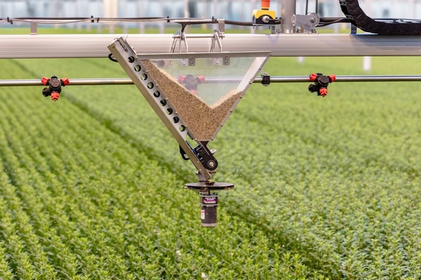 De spuitrobot is eenvoudig om te bouwen naar een strooirobot. Er hangen 6 bioverdelers aan de 9.60m spuitrobot voor het verstrooien van biologie, boven elk chrysantenbed één. De UniMite Discs zorgen voor het automatisch verstrooien van roofmijten en voermijten over het gewas. Het geeft een gelijkmatige afgifte en een uniforme verdeling. Eén Unimite Disc verstrooit de mijten over een totale werkbreedte van 1.60m. En dat levert een flinke arbeidsbesparing op. Het aansturen en programmeren van deze strooimachine gebeurt ook via de IPad.