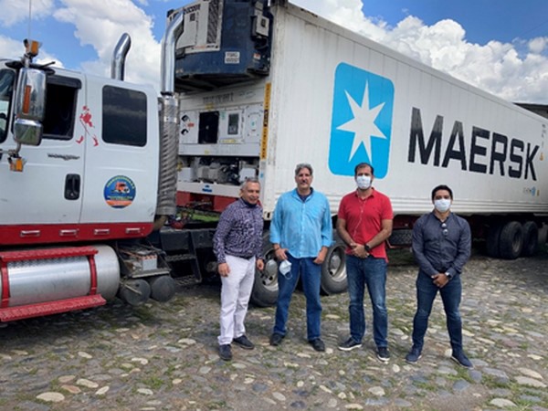 Alex Bustos (Green Control FQM), Carlos Vergara (Koelcontainer Specialist - Maersk), Johan Bacigalupo (Commerciëel Manager - Maersk) en Fohodil Galeas (Levering en Depots - Maersk)