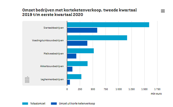 Nederlandse landbouwbedrijven behaalden in de periode van het tweede kwartaal van 2019 tot en met het eerste kwartaal van 2020 ongeveer 1,5 miljard euro omzet uit de zogenoemde korte keten verkoop. Dit is bijna een derde van de totale omzet van bedrijven die aan korte keten verkoop deden. Het aantal landbouwbedrijven dat omzet uit de korte keten haalt, is gestegen van 10,5 procent in 2017 naar 13,7 procent vorig jaar. Dat blijkt uit nieuwe cijfers van het CBS.