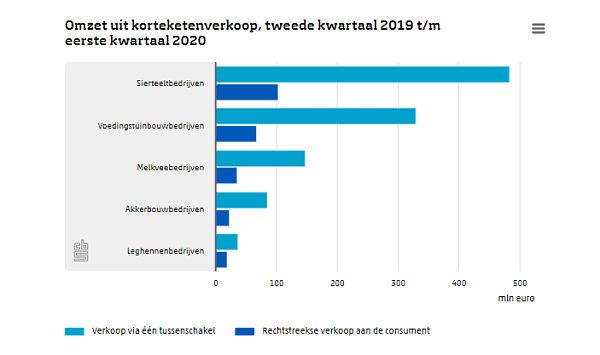 Bedrijven die actief zijn in de teelt van siergewassen behaalden in de genoemde periode 583 miljoen euro omzet uit de korte keten. 39 procent van de totale omzet die door landbouwbedrijven met korteketenverkoop werd behaald, kwam voor rekening van deze bedrijven. De voedingstuinbouw kwam tot een omzet van 398 miljoen euro, 26 procent van de totale omzet uit korteketenverkoop.