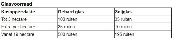 Glas ligt het meest voor de hand. Horticulture Services wijst erop dat de voorraad gehard glas de juiste verdeling moet hebben en de juiste glasmaten. 70% hoofdmaat, 15% luchtraam en 15% onder luchtraam.
