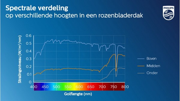 Het eerste wat opvalt is dat naarmate je verder naar beneden gaat in het gewas, het lichtniveau voor fotosynthetische actieve straling sterk afneemt (dit licht met golflengtes van 400-700 nm wordt ook wel Photosynthetic Active Radiation of PAR-licht genoemd). Het blijkt dat 95% van het PAR-licht geabsorbeerd wordt door het gewas. Het tweede opmerkelijke is dat deze afname aan intensiteit veel minder is voor ver-rood licht (dat golflengtes in het bereik van 700-800 nm heeft). Dit is te verwachten, door de lage absorptie door bladeren en de hoge doorlating van golflengten boven 700 nm. Uit deze grafiek kunnen we helaas nog niet zo goed aflezen of groen licht, dat golflengten heeft tussen 500 en 600 nm, dieper doordringt in het bladerdak vergeleken met rood en blauw licht.
