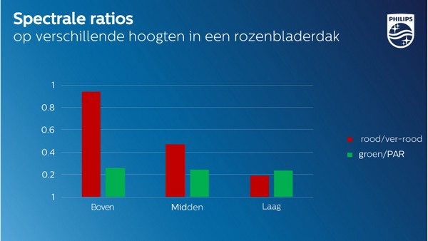 Ook kunnen we concluderen dat de verhouding tussen rood en ver-rood dramatisch afneemt in relatie tot de hoogte. Deze proeven laten duidelijk zien dat ver-rood het enige licht is dat dieper doordringt in een bladerdak dan de andere kleuren.