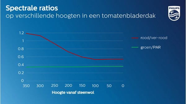 Het bovenstaande is ook getest bij een tomatengewas in een kas van Wageningen University & Research Bleiswijk in 2020. De resultaten zie je in grafiek 3. Deze metingen waren vergelijkbaar met die van het rozenbladerdak, alleen werd het spectrum nu gemeten met intervallen van slechts 50 cm. Toch viel hetzelfde resultaat te onderscheiden: de verhouding groen in PAR-licht is op elke hoogte constant, terwijl de verhouding tussen rood en ver-rood wel verandert.