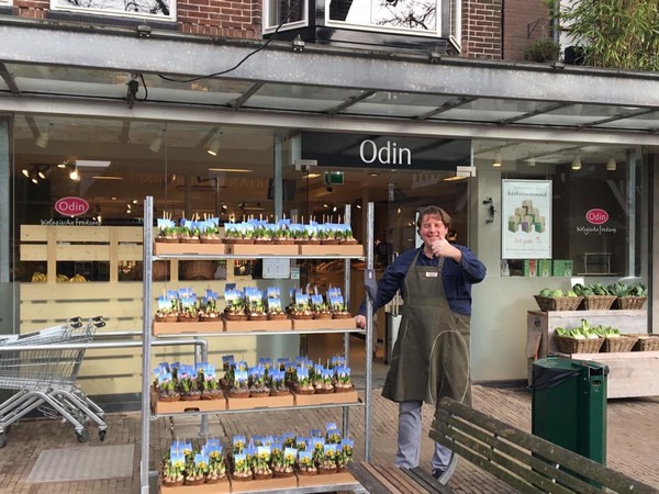 Tholen - Het is deze week ideaal weer om de bloemetjes buiten te zetten. Bij 25 Odin-winkels vatten ze dit heel letterlijk op. Zij hebben een kar vol biologische bloembollen naast de ingang van de winkel neergezet. De bio-bloembollen zijn geteeld en op pot gezet door John en Johanna Huiberts uit Sint Maartensvlotbrug. "Het is niet alleen een eyecatcher zo voor de winkel, maar ook nog eens de beste plek om deze voorjaarsbloeiers te bewaren", vertelt John.