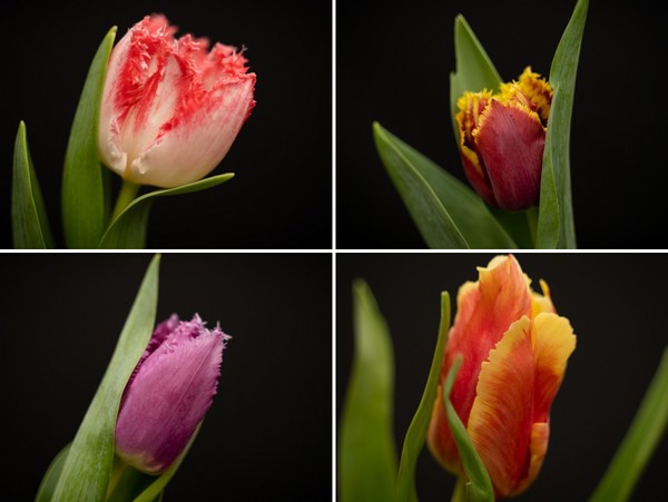 Het soort Neglige is bijzonder door de lichte zelfs bijna witte kleur en de roze gefranjerde rand. Met een beetje verbeelding is wel te begrijpen waarom de Neglige naar een verleidelijke nachtjapon vernoemd is. Een tulp is vol van tederheid en zachtheid. Mercure is een donkerroze tulp met een gele rand, een opvallend contrast dat niet onopgemerkt zal blijven wanneer deze tulp op de vaas zal ontluiken. Het derde gefranjerde soort is de donkerpaarse tulp San Luiz. Een tikkeltje mysterieus maar een prachtig nieuw soort dat kracht uitstraalt.