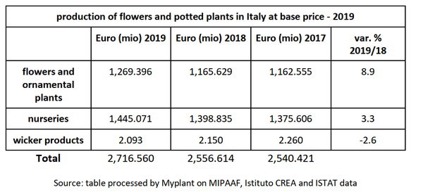 In 2019 nam de productie in Italië met 5,8% toe en dit was voornamelijk te danken aan een grotere vraag naar potplanten (+ 8,9%) en een toegenomen vraag naar kwekerijproducten (+ 3,3%). Rotan producten bleven stabiel in hun afname, zoals te zien is in onderstaande tabel.