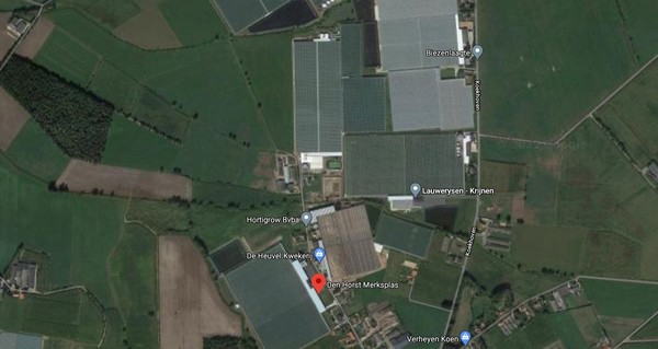 Screenshot van de WaterRadar ingezoomd op glastuinbouw in Merksplas. Zie hieronder ter vergelijking Google Earth.
