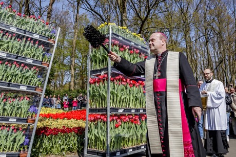 Archief foto: bisschop van Rotterdam Hans van den Hende zegent de rozen voor vertrek.