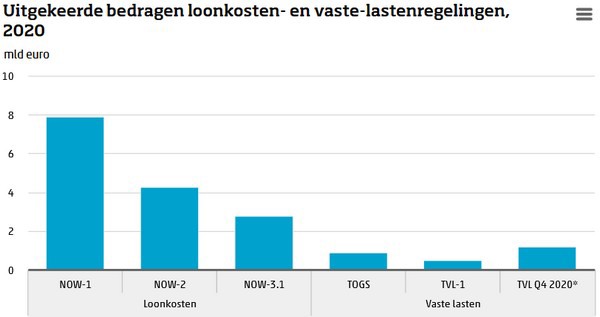 In 2020 hebben bedrijven in totaal 15 miljard euro aan loonkosten vergoed gekregen via de NOW-regeling. Daarnaast is 2,6 miljard euro aan vaste lasten vergoed vanuit de TOGS/TVL-regelingen. Voor zowel NOW als TOGS/TVL waren er in 2020 drie aanvraagperioden. Het uitgekeerde bedrag was voor de NOW het hoogst in de eerste aanvraagperiode. Bij de vaste-lastenregelingen is het hoogste bedrag uitgekeerd in de derde aanvraagperiode. Toen werd de TVL-regeling, die eerst alleen opengesteld was voor specifieke sectoren, uitgebreid naar vrijwel alle branches. Het gaat bij beide type regelingen om toegekende subsidies op basis van een verwacht omzetverlies. De daadwerkelijke subsidies worden achteraf vastgesteld op basis van het werkelijke omzetverlies, en kunnen hoger of lager uitvallen.