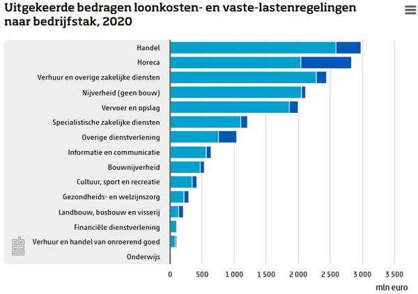 Het grootste deel (17 procent) van de subsidies voor loonkosten en vaste lasten werd uitbetaald aan bedrijven in de handel. Het gaat in totaal om bijna 3 miljard euro, waarvan 2,6 miljard euro subsidies voor loonkosten. Binnen de handel ontving de groothandel de meeste coronasteun (1,5 miljard euro), daarna volgen de detailhandel (1 miljard euro) en de autohandel en –reparatie (0,5 miljard euro). Na de handel ontvingen bedrijven in de verhuur en overige zakelijke diensten het hoogste bedrag aan loonkostenvergoeding (2,3 miljard euro). Hiervan ging het grootste deel naar de uitzendbureaus en arbeidsbemiddeling (1,5 miljard euro). Op de gezondheids- en welzijnszorg na zijn de handel en verhuur en overige zakelijke diensten de bedrijfstakken met de meeste werknemersbanen, met respectievelijk 17 en 12 procent van het aantal werknemersbanen in december 2020.