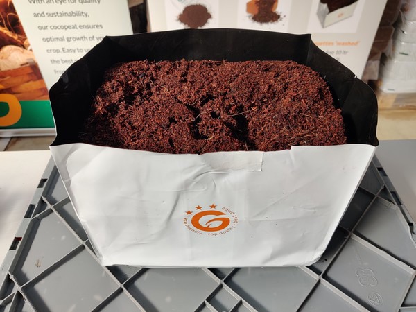 Onder het consumentenmerk Grow.in zijn er drie verschillende typen kokosproducten te verkrijgen. Twee daarvan zijn gebufferd en gewassen: het ready-to-use kokosgruis, los aangeboden in zakken van 50 liter, en de blokken van 4.5 kilogram, verkrijgbaar in drie grofheden. Met die blokken kan zo’n 50-60 liter potgrond gemaakt worden. De derde variant is m.n. bedoeld voor de grotere hobby-kwekers: blokjes gewassen kokos, en niet gebufferd, ofwel niet bemest met calcium. Deze zijn te verkrijgen in blokjes en als grow-pot. “Door ongebufferd substraat aan te bieden, kunnen telers eventueel zelf kiezen voor een biologische plantenvoeding,” legt Wim uit. “Daar is met name in Noord-Amerika ook veel vraag naar.”