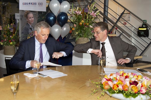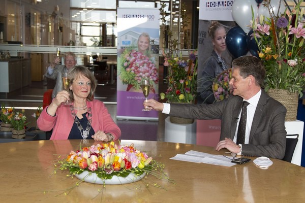 Na het proostmoment met de burgemeester, nam Hugo Noordhoek Hegt, CEO van de Dümmen Orange groep, plaats aan de talkshow tafel. Hij gaf aan dat de bloembollen een mooie aanvulling zijn op het product-portfolio van Dümmen Orange. Alle stappen die worden gezet op het gebied van resistentieveredeling en verkorten van de veredelingscyclus van de tulp maken hem bijzonder trots. Hugo kreeg uit handen van Foeke Gardenier het eerste exemplaar van het jubileum-magazine van Hobaho uitgereikt. Dit jubileum-magazine zal deze week worden verstuurd aan de klanten van Hobaho. Hugo Noordhoek Hegt overhandigde op zijn beurt, namens Dümmen Orange, een kunstwerk als cadeau aan Hobaho ter felicitatie voor het 100-jarig bestaan. Dit kunstwerk van kunstenares Kiek Bangert is een bronzen tulp gegoten in een epoxy kubus en zal later een mooie plek krijgen in de ontvangsthal van Hobaho.