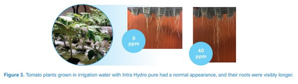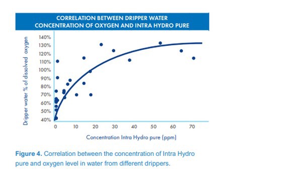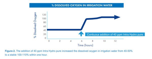 Intra Hydrocare is een zilver-gestabiliseerde desinfectans gebaseerd op waterstofperoxide dat na reactie langzaam afbreekt in water en zuurstof. Naast een bewezen effectieve water desinfectie laat dit artikel zien dat de toevoeging van Intra Hydrocare aan gietwater de concentratie opgelost zuurstof verhoogt naar een stabiel hoog niveau dat planten gezond houdt.