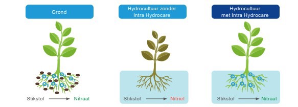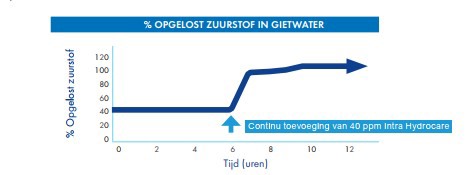 teelten kunnen de zuurstofniveaus in de wortelzone te laag worden, wat kan leiden tot toxische nitriet accumulatie. De toevoeging van Intra Hydrocare aan het irrigatiewater verhoogt het opgelost zuurstof niveau, wat de omzetting van stikstof naar plant-beschikbaar nitraat herstelt.
