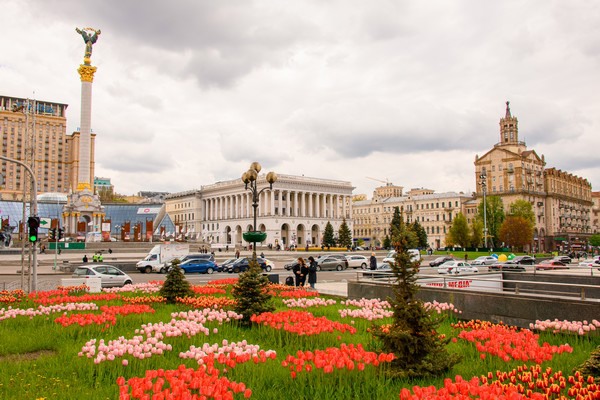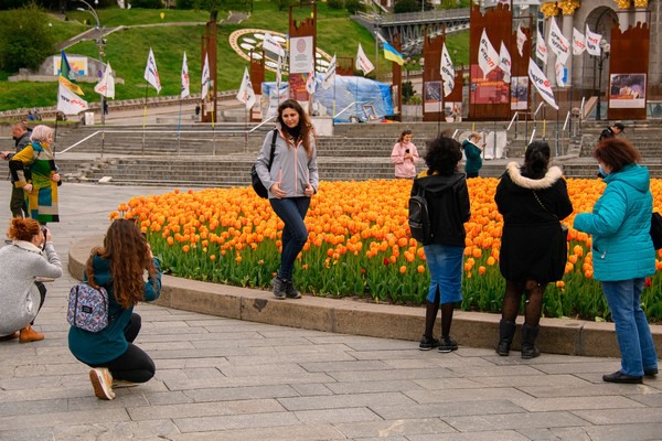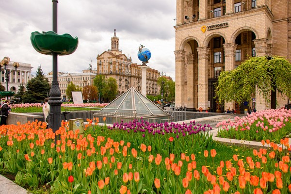 Ruim honderdduizend Nederlandse tulpen bloeien op het beroemde Maidanplein in de Oekraïense hoofdstad Kiev. Dagelijks komen duizenden mensen genieten van de Hollandse bloemenpracht.