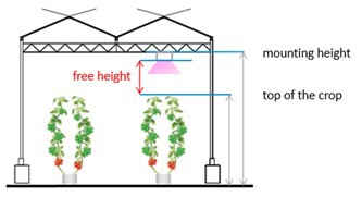 De eerste parameter om te controleren is de vrije hoogte. Dit is de afstand tussen de leds en de top van het gewas. De vrije hoogte kan veel invloed hebben op de uniformiteitswaarde in het algemeen. Bij hogedraadsgewassen, met een beperkte vrije hoogte van 1.50 tot 2.50m, kan het een uitdaging zijn om een goede, algemene