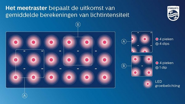 In het voorbeeld hieronder zie je twee posities van een berekeningsgebied binnen hetzelfde lichtplan. Situatie B zal veel betere gemiddelde lichtintensiteitswaarden opleveren, omdat de lichtintensiteit is berekend met een gebied wat meer pieken toont, en daardoor minder dipjes met de minimale hoeveelheid groeibelichting. Dit is geen goede weergave van de werkelijkheid na installatie.