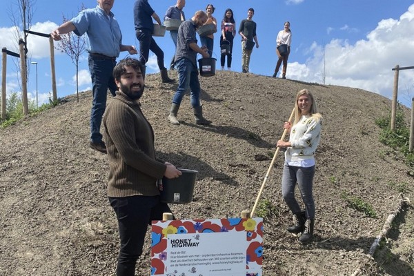 Een heuveltje bij Eosta's circulaire hoofdkantoor in Waddinxveen is afgelopen week omgedoopt tot 'Honey Hill', nadat het was ingezaaid met 40 tot 50 soorten inheemse bloemenzaden. Deze zomer zal het een bloemenzee zijn voor wilde bijen, honingbijen, hommels, vlinders en andere insecten. Medewerker Robert van Melle, productmanager citrusfruit & druif, was de initiatiefnemer: "Wij vragen van onze biologische telers wereldwijd om de biodiversiteit te ondersteunen aan de hand van de Duurzaamheidsbloem. Maar wat doen we zelf? We hebben nu de omgeving rond ons kantoor verrijkt en alle medewerkers hebben zaadjes meegekregen voor thuis. Bee the change you want to see in the world!"