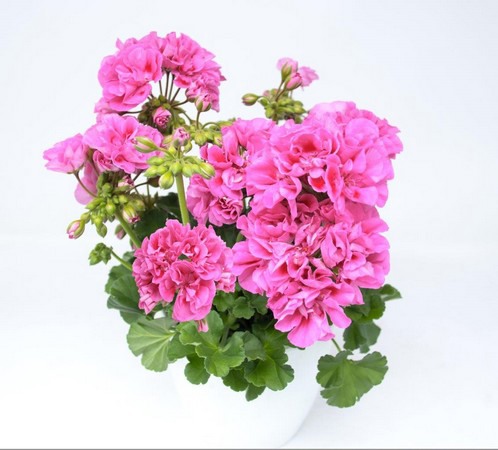 Solfaro Valongo, een goed gevulde bloem in fris roze met frisgroen blad zonder zone. Een pelargonium voor een jong publiek die goed te combineren is met andere roze bloemen zoals hangpetunia's.