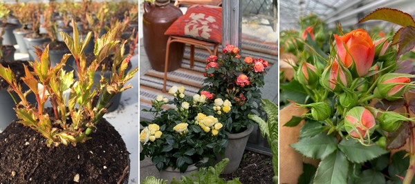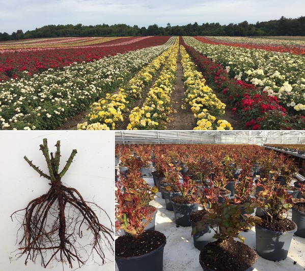 Met de klok mee, Sweet Home Roses velden in Denemarken, Sweet Home rozen in de kas en Sweet Home Rose met kale wortel, klaar om op te potten (zal na 6-7 weken bloeien)