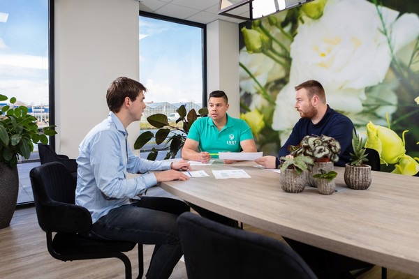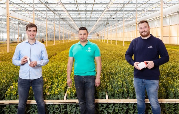 Vlnr: Dirk Timmers (Royal Brinkman), Wesley van der Lugt (Lugt Lisianthus) en Jef van Gorp (Roam Technology).