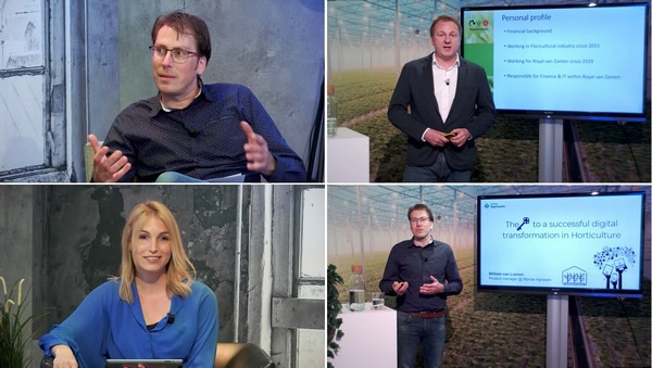 Van linksboven mee met de klok: William van Loenen, product manager bij Mprise Agriware, Ernst Barendregt, CFO bij Royal van Zanten, nog een keer William, en host Irene Hartkamp.