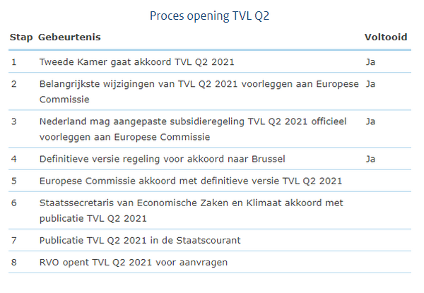 De eerste informele aankondiging bij de Europese Commissie van de aangepaste subsidieregeling voor tegemoetkoming Vaste Lasten, ofwel de TVL Q2, is goed verlopen. Het ministerie van Economische Zaken en Klimaat kan nu door met het officieel voorleggen van de wijzigingen in de subsidieregeling. Hiermee ligt de start van de regeling op koers voor de tweede helft van juni.
