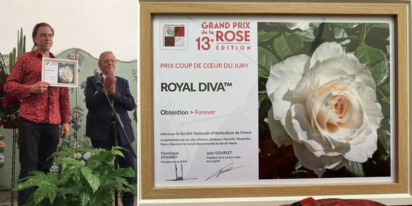 Op 3 juni heeft Roses Forever wederom een prijs gewonnen voor een van haar tuinrozen. De zogeheten 'Prix coup de coeur du jury 2021' ging naar Royal Diva Plant 'n'Relax. Veredelaar Rosa Eskelund is zeer enthousiast: "Het is de meest prestigieuze prijs die je kan krijgen voor een roos in Frankrijk." Helaas kon ze zelf de prijs niet in ontvangst nemen door de huidige reisrestricties, dus heeft ze een vriend gevraagd om de honneurs waar te nemen in Park De Bagatelle Nord in Parijs.