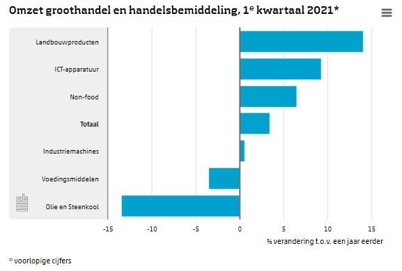 In het eerste kwartaal van 2021 boekten de meeste branches in de groothandel meer omzet in vergelijking met dezelfde periode een jaar eerder. In de groothandel in landbouw, de groothandel in ICT-apparatuur, de groothandel in non-food en de groothandel in industriemachines was de omzet hoger. Ook de groothandel in voedingsmiddelen behaalde minder omzet dan een jaar eerder. Tot deze laatste branche worden zowel ondernemers gerekend die voedingsmiddelen aan de detailhandel leveren, als ondernemers die aan de horeca leveren.