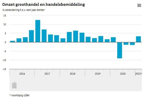 De groothandel en handelsbemiddeling heeft in het eerste kwartaal van 2021 ruim 3 procent meer omzet behaald dan in dezelfde periode een jaar eerder. Dit is de eerste omzetgroei na drie kwartalen van krimp. Het aantal faillissementen bedroeg in het eerste kwartaal 39, dit was niet eerder zo laag. Het vertrouwen van ondernemers in de groothandel nam toe, en bedrijven verwachten meer personeel nodig te hebben in de komende maanden. Ondernemers in de groothandel hadden positievere verwachtingen over de export. Dit meldt het CBS op basis van nieuwe cijfers.