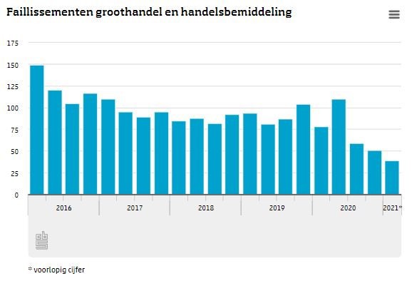 In het eerste kwartaal van 2021 werden 39 faillissementen uitgesproken in de groothandel en handelsbemiddeling. Na een kleine piek in het aantal faillissementen in het tweede kwartaal van 2020, neemt het aantal faillissementen al drie kwartalen op rij af. Dat er minder bedrijven failliet verklaard werden, wordt deels veroorzaakt door de noodsteun van de overheid tijdens de coronacrisis.