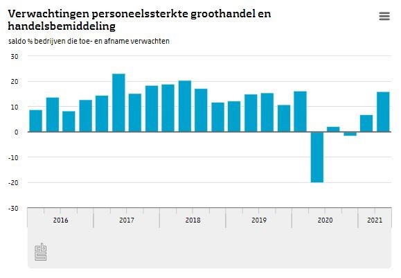 Ondernemers in de groothandel en handelsbemiddeling waren aan het begin van het tweede kwartaal van 2021 optimistischer gestemd dan een kwartaal eerder. Het toegenomen vertrouwen is terug te zien in de verwachtingen rond de personeelssterkte. Per saldo 15,9 procent van de ondernemers verwacht dat het aantal personeelsleden zal toenemen in de komende drie maanden. Het saldo wordt bepaald door het percentage positief gestemde ondernemers te verminderen met het percentage negatief gestemde ondernemers.