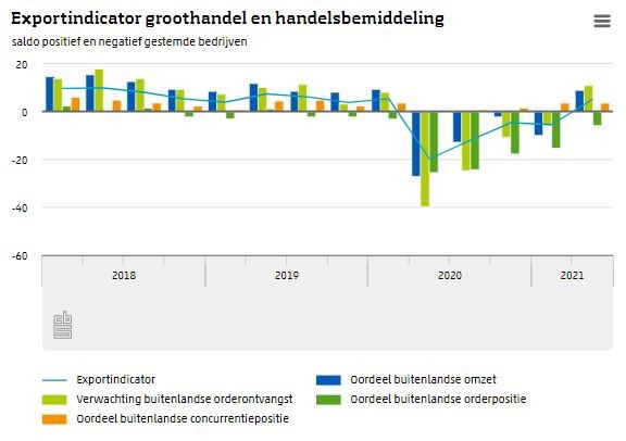 Bij ondernemers in de groothandel is in het tweede kwartaal van 2021 het pessimisme over de exportontwikkeling van de voorgaande vier kwartalen omgeslagen naar optimisme. Dit komt met name door een verbeterd oordeel over de buitenlandse omzet en door verbeterde verwachtingen voor de buitenlandse orderontvangst in de komende drie maanden. Hoewel het oordeel over de buitenlandse orderpositie verbeterde, is dit de enige indicator waarover groothandelaren nog negatief zijn. Over de buitenlandse concurrentiepositie zijn de groothandelaren onveranderd positief.