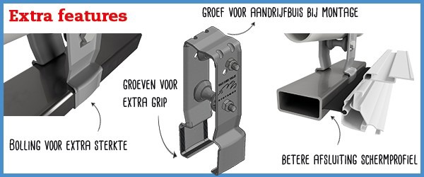 Door het smallere ontwerp van de klem valt er meer zonlicht op het gewas. Dat is natuurlijk gunstig voor de opbrengst. De bolling in de klem zorgt voor extra sterkte en betere afsluiting van het schermprofiel, zodat er minder warmte en licht verloren gaat. Ook zijn er groeven aan de onderzijde aangebracht voor extra grip op het spant, en ook is er een groef aan de bovenzijde aangebracht voor de voormontage aandrijfbuis. De klem is hiermee gemakkelijker te monteren.