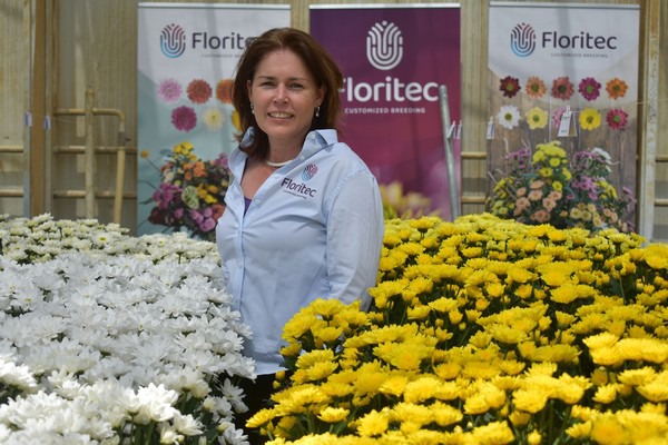 Daphne Hoogeveen, marketing & communicatie specialist bij Floritec, tussen de Chryssanten. Floritec presenteerde hun nieuwe uitstraling op het event. Ook waren er natuurlijk nieuwe soorten te zien en uitbreidingen van bestaande bekende rassen zoals de Maverick White en de Hardwell Bright en de Hardwell Yellow.