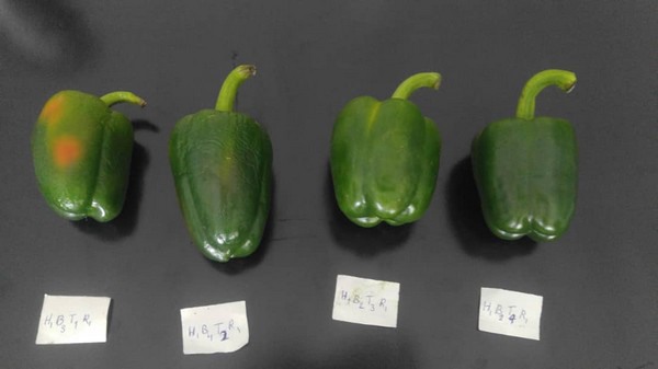 Het effect van thiosulfaat op de houdbaarheid van paprika na 20 dagen. De controlegroep links was gerimpeld terwijl de behandeling met CaTs® rechts er nog goed uit zag. De 2e en 3e paprika zijn behandelingen met verschillende concentraties KTS®(kaliumthiosulfaat)