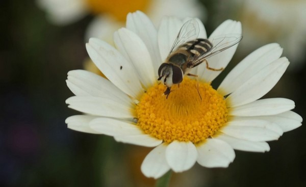 Volwassen zweefvliegen leven vaak van pollen en nectar, zoals dit exemplaar op een margriet. Van sommige soorten zijn de larven natuurlijke vijanden van bladluizen, belangrijke plaaginsecten op veel landbouwgewassen. Foto: Paul van Rijn