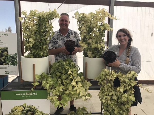 En op een andere locatie, bij Armstrong Growers in Santa Paula, Robert Bett en Amanda Fliont met Hedera Tropical Blizzard & Semps