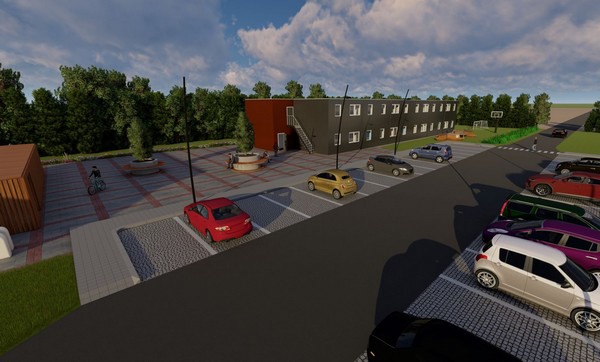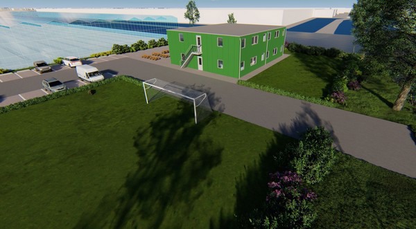 Een voorbeeld van hoe de modulaire woonunits die Blueblox aanbiedt geplaatst worden.