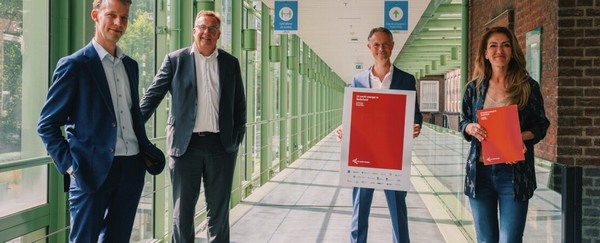Vlnr: Bas Ebskamp, Senior Energie en klimaat, de Argumentenfabriek, Jan Willem van Hoogstraten, CEO EBN, Olof van der Gaag, directeur Nederlandse Vereniging Duurzame Energie, en Dilan Yeşilgöz, Staatssecretaris van Economische Zaken en Klimaat.