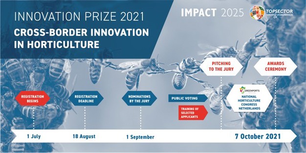De uitreiking van de Innovation Prize vindt plaats tijdens het Nationaal Tuinbouw Congres op donderdag 7 oktober 2021 in het Bomencentrum Nederland in Baarn. Drie finalisten pitchen hier hun innovatie voor een deskundige jury. Er zal een interactieve workshop georganiseerd worden door World Startup waarbij innovatieve startups en ondernemers aan elkaar gekoppeld worden