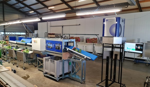 De opstelling zoals deze nu staat bij Peeters Hortensia’s in Zevenbergen. Rechts het camerasysteem, links de sorteerband.