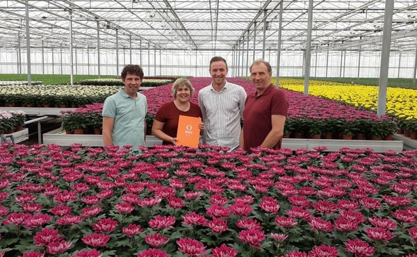 Van links naar rechts: Marcel van der Voort (eigenaar, Van Schie), Noëlia Mansilla (President EMEA, Dümmen Orange), Mike van Os (Global Product Manager Pot Plants, Dümmen Orange), Hans van Leeuwen (eigenaar, Lionplant)