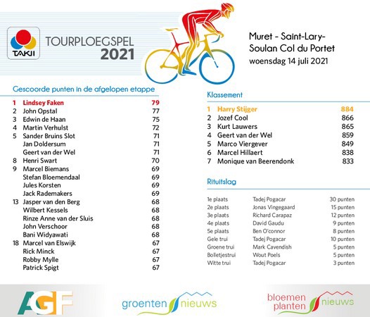 De virtuele gele trui blijft om de schouders van Harry Stijger. Maar... In het Takii Tourploegspel is het mogelijk alvast vooruit te kijken naar het eindklassement. En dan zou, zoals het er nu uitziet, Geert van der Wel aan het langste eind trekken. De virtuele eindscore kan net als het algemeen klassement de komende dagen natuurlijk nog wel veranderen. Spannend wordt het dus sowieso.