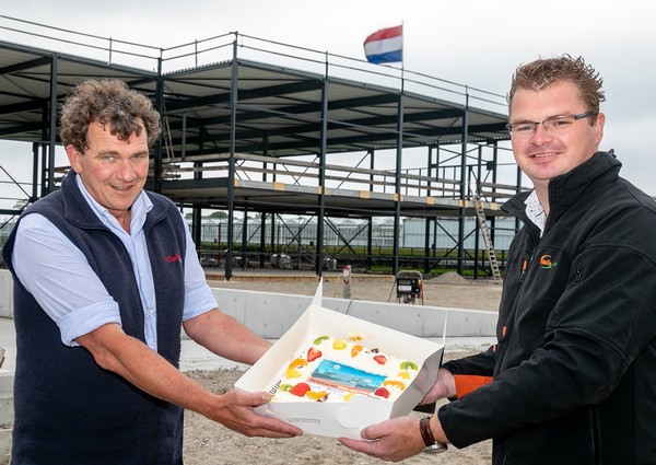 Op de foto overhandigt Nico van der Smit, bedrijfsleider bij Vitelia Agrocultuur in Hazerswoude-Dorp, een taart aan Toska Stam, kort nadat de vlag samen met de aannemer in top is gezet. Nico: “Ik ben trots dat we dit ‘hoogtepunt’ nog vóór de bouwvak mogen delen. We kijken er nu al naar uit om onze klanten en leveranciers hier over enkele maanden te mogen ontvangen.”